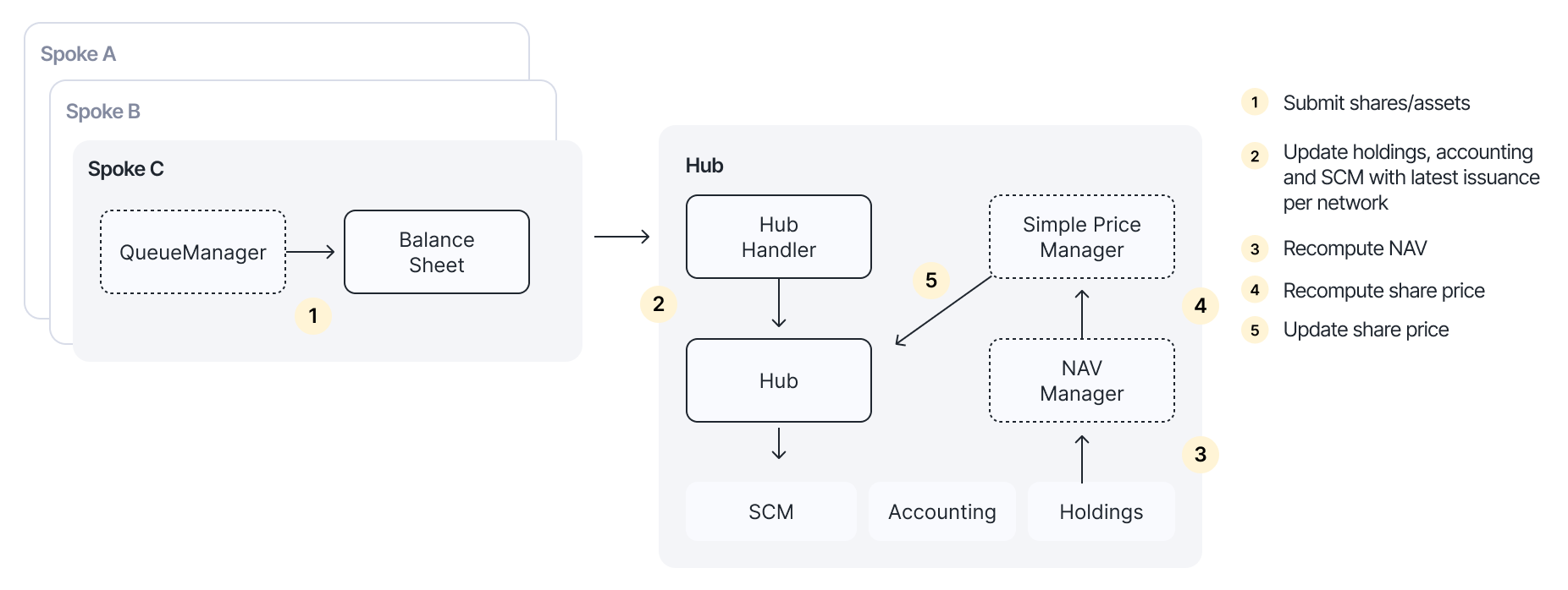 The QueueManager flushes these queues in batches. It wraps all pending updates into a single gateway.withBatch() call, sending one cross-chain message per spoke that contains every asset and share delta since the last sync. On the hub, each update is unpacked into journal entries that update the accounting state.